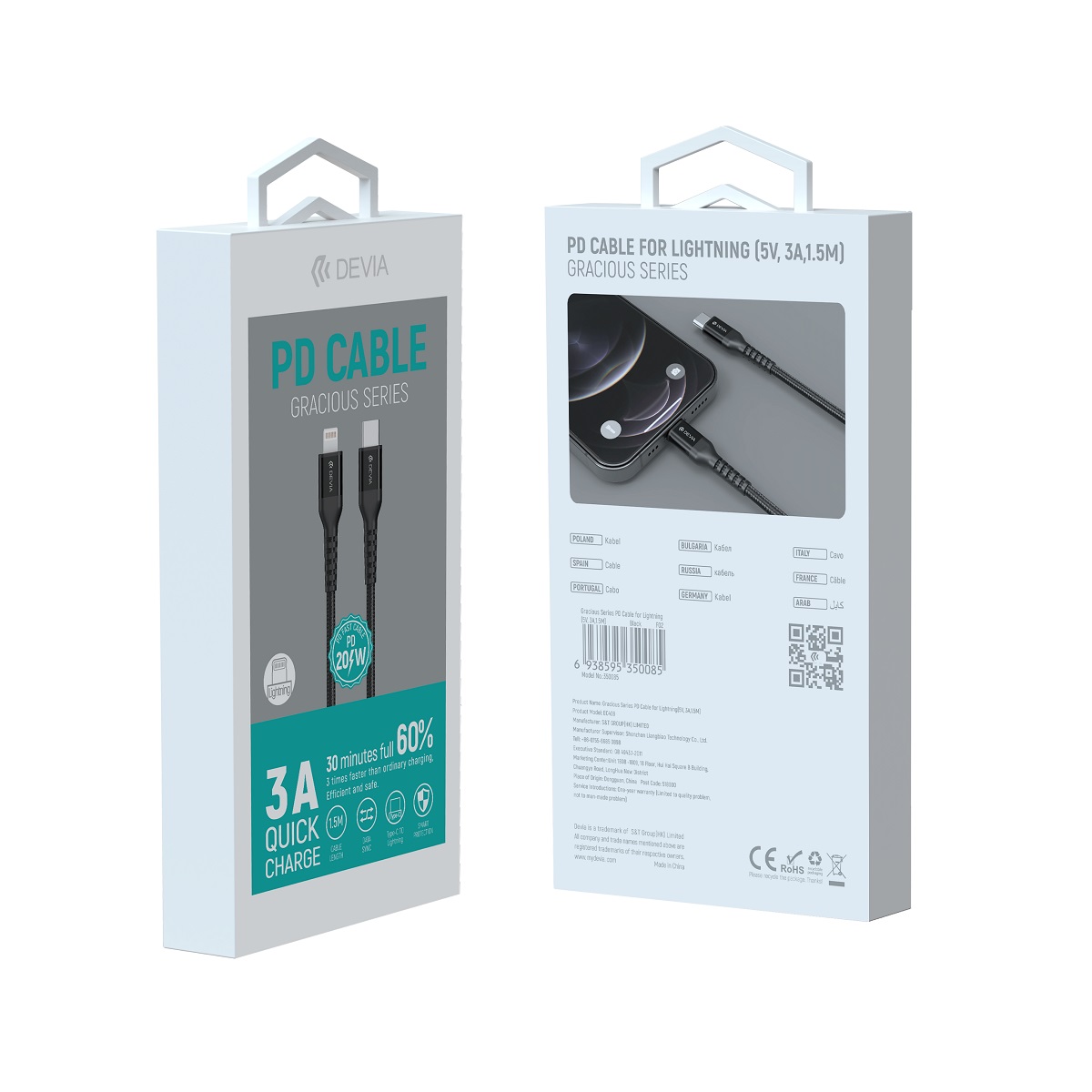 Devia Gracious PD is a cable equipped with USB-C and Lightning connectors. The cable has been designed to provide the greatest possible comfort for everyday use. The cable will allow you to fully use the maximum power with which compatible devices can be charged. Made of flexible silicone with a nylon braid, it ensures long service life.