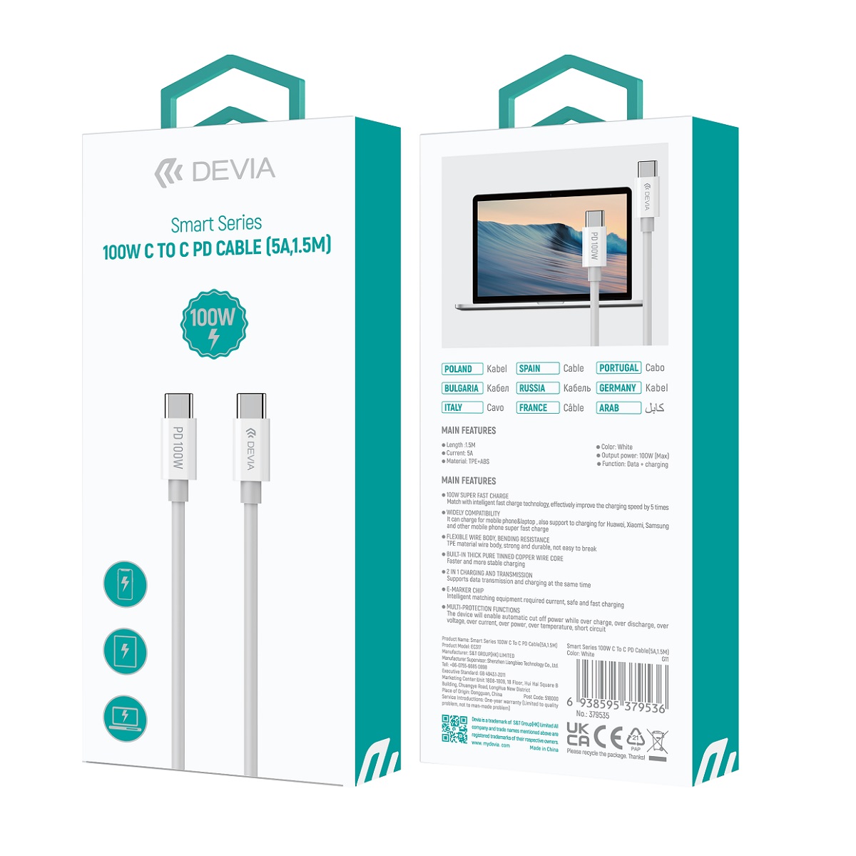 Devia Smart PD is a cable equipped with USB-C and USB-C connectors with a power of 100W. The cable has been designed to provide the greatest possible comfort for everyday use. The cable will allow you to fully use the maximum power with which compatible devices can be charged. Made of flexible silicone