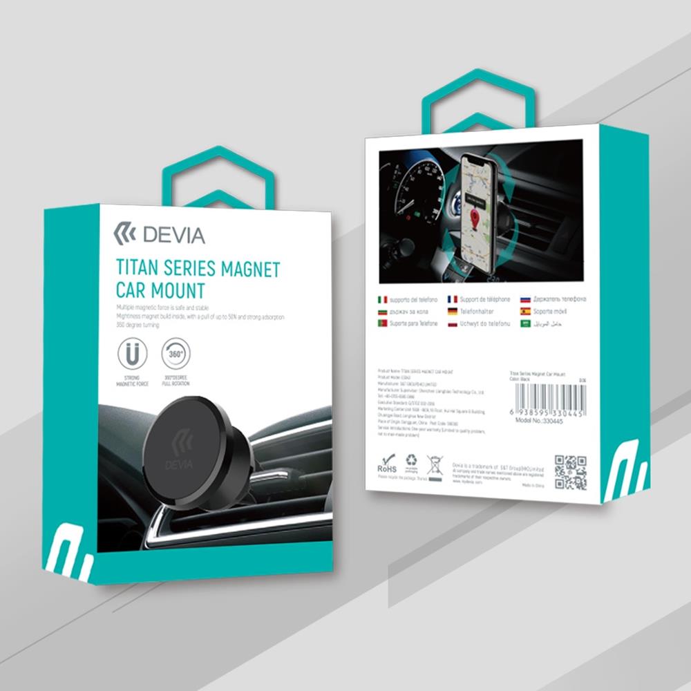 Devia Titan is a universal magnetic holder for car ventilation grille. Its small dimensions perfectly fit into any space. The kit includes metal stickers.