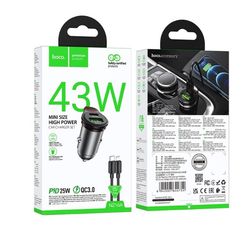 Hoco NZ16A car charger USB A + Type C + cable Type C to Lightning PD QC3.0 43W metal gray